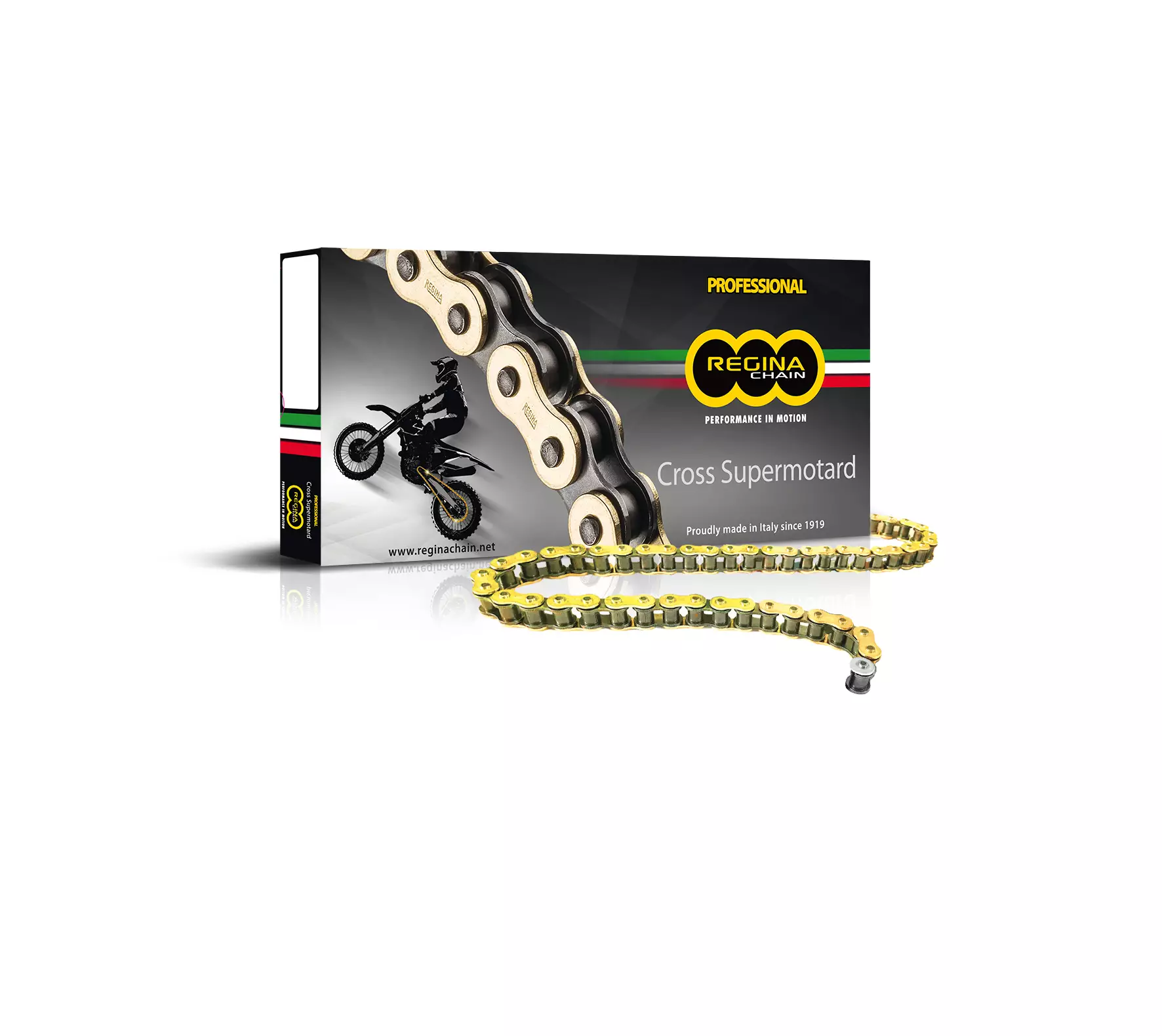 Cross SupermotardPremiumDesigned to ensure high resistance to elongation and to the severe impulsive stresses caused by Off-Road riding. Extended bushings and solid rollers, alloy carbon steel pins, shot-peened plates to offer increased tensile strength and fatigue resistance are some of the most important features.International reference: 428Regina reference: 126 RH2